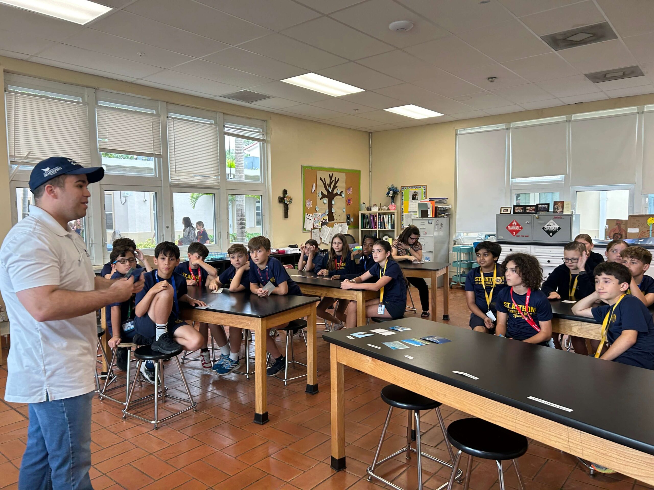 On the morning of March 30th, 2026, The International SeaKeepers Society visited St. Anthony Catholic School for a four-class lesson series with 113 5th and 6th grade students as well as 10 educators. Throughout the day, we hosted activities and discussion for four separate classes, two fifth grade and two sixth grade courses. With each class, our Education team led an interactive discussion on food webs, animal relations, and comparative physiology of key animal groups including mammals, sea birds, fish, and invertebrates. After our introductory discussion, we split each group of students into breakout sessions to play a game and practice their identification skills with our activity, Creatures from the Beach. Students made observations about animal physiology, made inferences about their behavior and niche, and even figured out distinguishing traits of key animal groups from one another. We had an amazing day working with the students of St. Anthony and we give a huge thanks to the incredible educators for facilitating and hosting us, and we hope to work with them all again in the near future!