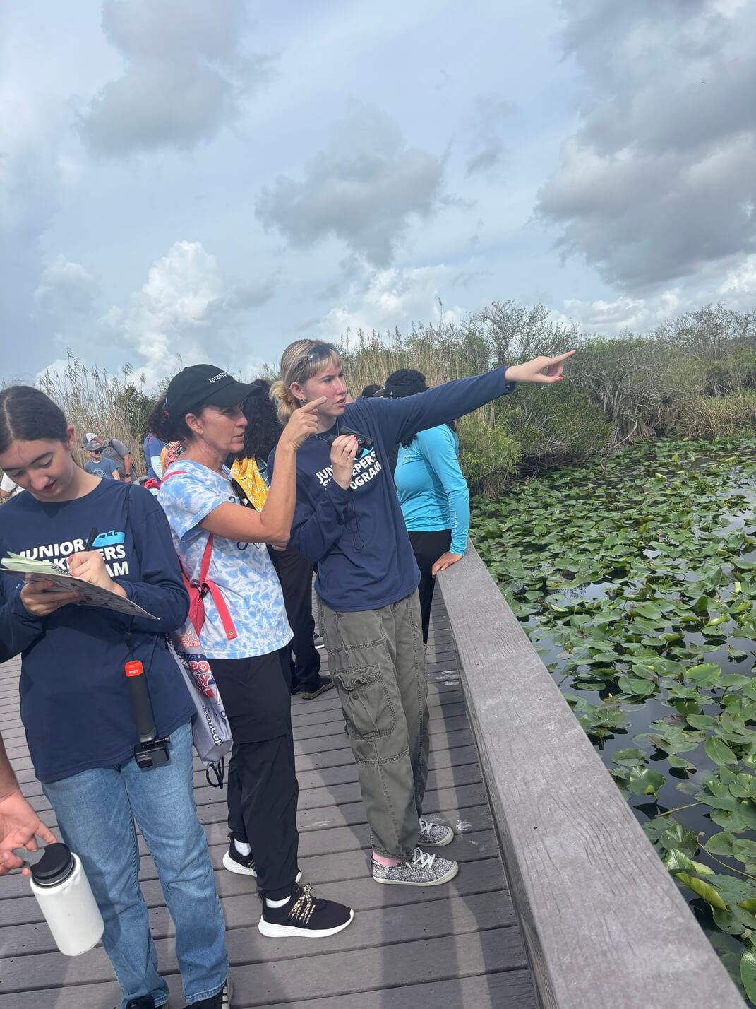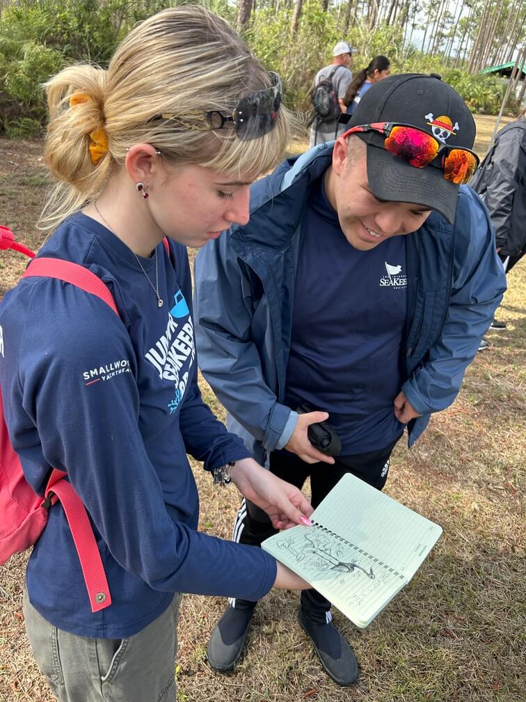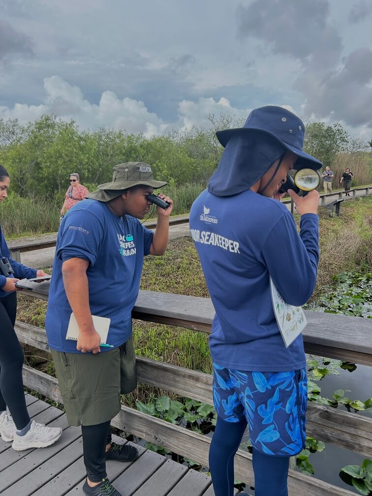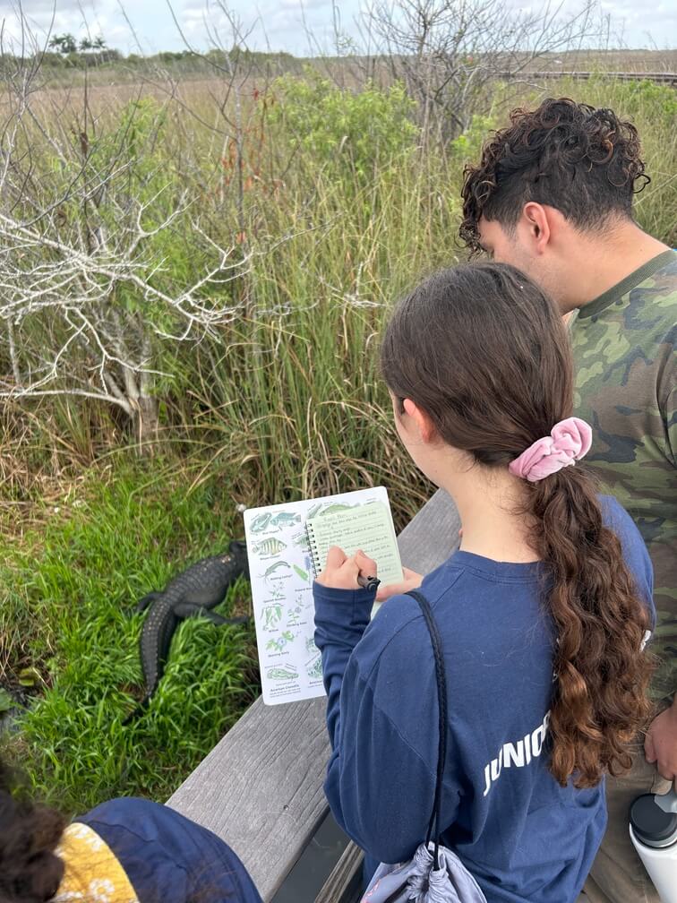 We started our day by meeting up at Ernest F. Coe Visitors Center and participating in a quick introduction to the park, what makes it special, and a crash course on some of the unique ecosystems that encompass the Everglades led by our trip leader and Park Ranger Colby. After a short drive to Anhinga Trail for our first hike, our team gifted the Junior SeaKeepers with waterproof field journals and pens, as well as binoculars to identify and chart some of the incredible species we hoped to see throughout the day. Led by our guide Colby, we were able to see a massive amount of biodiversity from plant life like sawgrass and mangroves to megafauna like more than ten American Alligators, juvenile and adult Anhingas, Cormorants, several Red-bellied Slider turtles, and various kinds of fish. As we moved down the trail, Colby took the time to explain some of the intricacies of the ecosystems as well as the animals that call it home, and the critical role the Everglades plays as the source of much of the freshwater in all of Florida. Our students took the time to take some great pictures of the ecosystem, record some observations, and even draw some of the wildlife we encountered on our first hike.