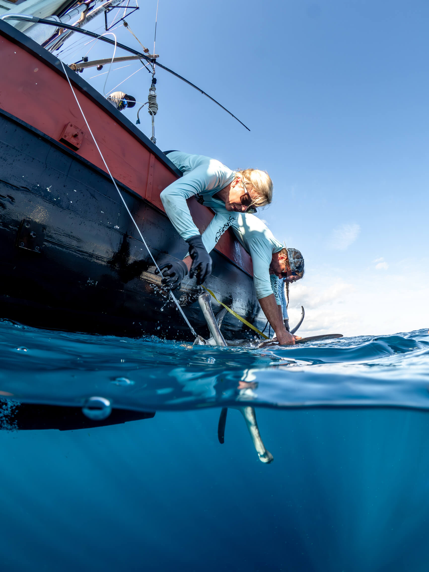 Field conditions allowed the teams to deploy lines shortly after arriving on site. Throughout the day, OFI scientists and the DISCOVERY Yacht crews worked together to safely capture, tag, measure, and release five sharks in total: three nurse sharks, one tiger shark, and one great hammerhead – a species listed as Critically Endangered on the IUCN Red List. Each shark was processed following OFI’s standardized protocol, including length and girth measurements, tagging, and the collection of biological samples, before being released in stable condition.